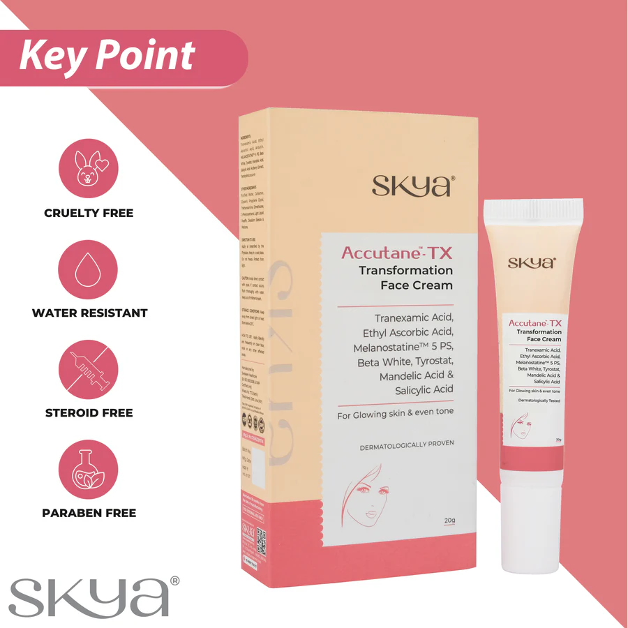 SKYA îți încheie căutarea cu Crema de față transformatoare. Un produs puternic pentru îngrijirea pielii, format dintr-o varietate de ingrediente benefice, crema conține acid tranexamic și acid etil-ascorbic care combat hiperpigmentarea și iluminează pielea. Tyrostatul și melanostatina-5 acționează împreună pentru a inhiba producția de melanină, iluminând astfel nuanța pielii. Conținutul de acid salicilic și acid mandelic exfoliază pielea, îmbunătățindu-i textura. Toate componentele cremei acționează împreună pentru a facilita estomparea petelor întunecate, iluminând nuanța pielii și promovând un ten mai radiant.